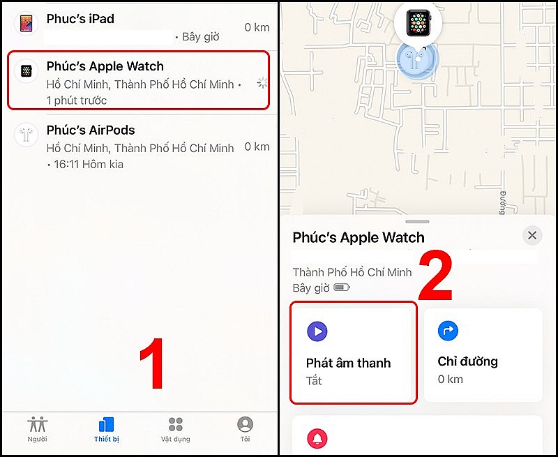 Vào ứng dụng Tìm trên iPhone > Ở ô Thiết bị chọn tên Apple Watch > Bấm Phát âm thanh.