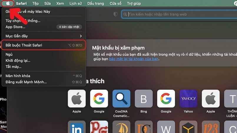 Nguyên nhân đầu tiên có thể dẫn tới tình trạng MacBook bị treo là khi bạn đang sử dụng trình duyệt hoặc ứng dụng trên thiết bị. Có thể ứng dụng hoặc trình duyệt đã được sử dụng liên tục, gặp một số lỗi loading nên dẫn tới việc MacBook của bạn bị đứng. Để thoát khỏi lỗi, bạn có thể buộc thoát ứng dụng bằng cách chọn menu Apple > Chọn Bắt buộc Thoát.