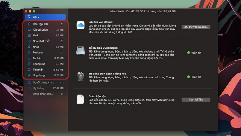 Bước 4: Lúc này bạn sẽ thấy cửa sổ quản lý các mục lưu trữ dữ liệu trên MacBook của bạn. Bạn hãy tiến hành kiểm tra và chọn các mục có chứa các dữ liệu không dùng đến và xóa các dữ liệu, ứng dụng đó đi để tránh tình trạng MacBook bị treo nhé!