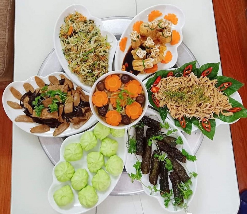 Ngoài ra, mâm cỗ chay cúng Rằm tháng Chạp không thể thiếu được những món như rau củ luộc, canh nấm, nem chay rau củ, bánh chưng đậu xanh...