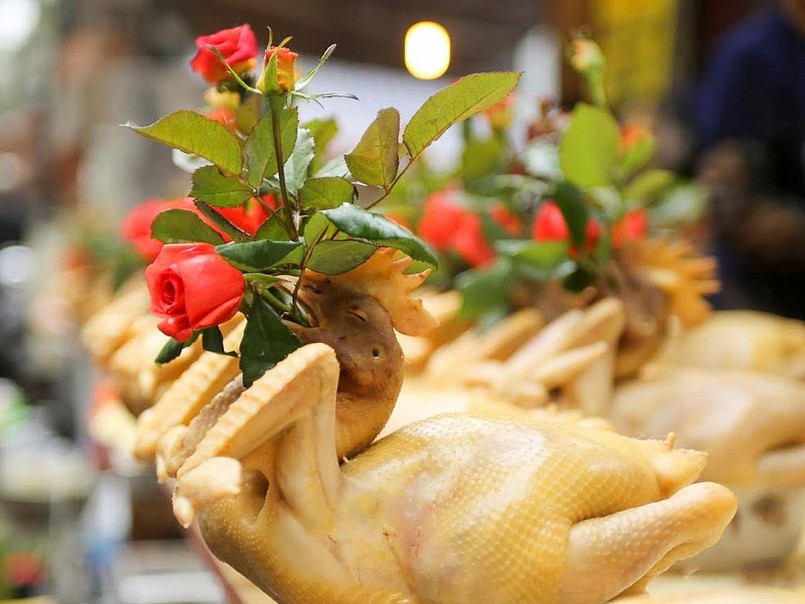 Trong mâm cỗ cúng ngày Rằm tháng Chạp không thể thiếu được một con gà luộc cánh tiên. Gà nên chọn gà trống để dâng cúng, vừa thể hiện được sự chu đáo, dáng gà bày mâm cúng lại đẹp. Gà luộc cánh tiên da căng bóng, màu vàng đẹp, đầu ngẩng cao, hai cánh xoè ra, có thể trang trí cho gà ngậm bông hoa hồng.