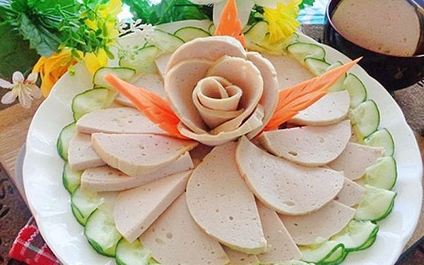 Những đĩa giò, chả được cắt tỉa hình hoa đẹp mắt góp phần giúp mâm cỗ thêm trọn vẹn. Ngoài ra, nhiều chị em nội trợ cũng làm các món giò đủ hương vị màu sắc như giò cuốn ngũ sắc, giò cuốn tai heo...