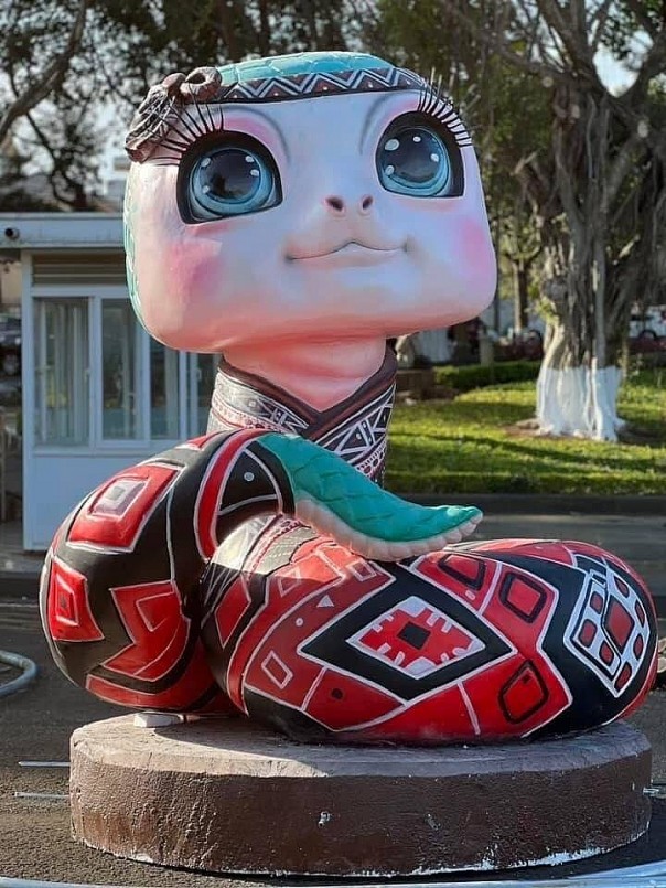 Mô hình linh vật rắn oai hùng này đang được lắp đặt tại Phú Yên. Chú rắn có tư thế cuộn mình uyển chuyển, đôi mắt sáng rực, thể hiện sự can trường và khôn ngoan - những phẩm chất thường được liên kết với "xà vương".