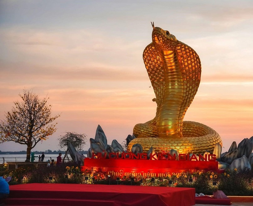 Mô hình linh vật rắn đầy ấn tượng đang lắp đặt tại khu vực ven biển thành phố Rạch Giá, tỉnh Kiên Giang, cũng thu hút sự chú ý của người dân và du khách. Đây là chú hổ mang chúa màu vàng rực, trọng lượng hơn 1,2 tấn. Màu vàng rực rỡ không chỉ tượng trưng cho sự thịnh vượng và may mắn mà còn khiến bức tượng trở nên nổi bật dưới ánh nắng mặt trời miền biển.