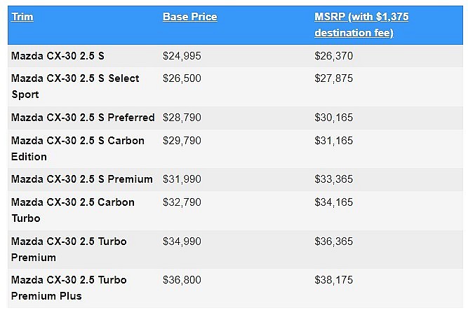 Dưới đây là bảng giá chi tiết các phiên bản Mazda CX-30 2024 tại thị trường Mỹ: