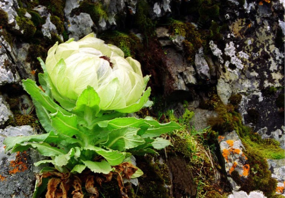 Có lẽ thoạt nhìn ai cũng nghĩ đây là bắp cải, thực ra tuy nhìn từ xa giống bắp cải nhưng khi nhìn kỹ bạn sẽ cho rằng chúng còn đẹp hơn bắp cải. Loại thực vật này thực ra được gọi là hoa sen tuyết, sở dĩ có tên gọi này là vì khi nở hoa nó rất giống hoa sen, lại mọc ở vùng núi cao nên còn được gọi là hoa sen tuyết Thiên Sơn (khu vực Tân Cương, Tây Tạng, Trung Quốc).