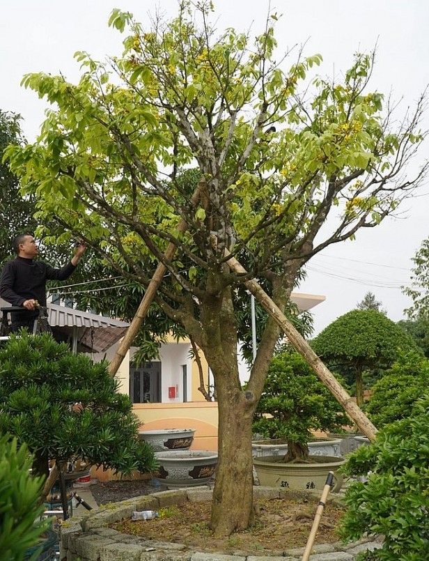 | Cụ mai cổ thụ có chiều cao 6m, đường kính tán rộng 5m. Dáng mai thế tự nhiên, 1 thân phân 3 nhánh rõ ràng. |