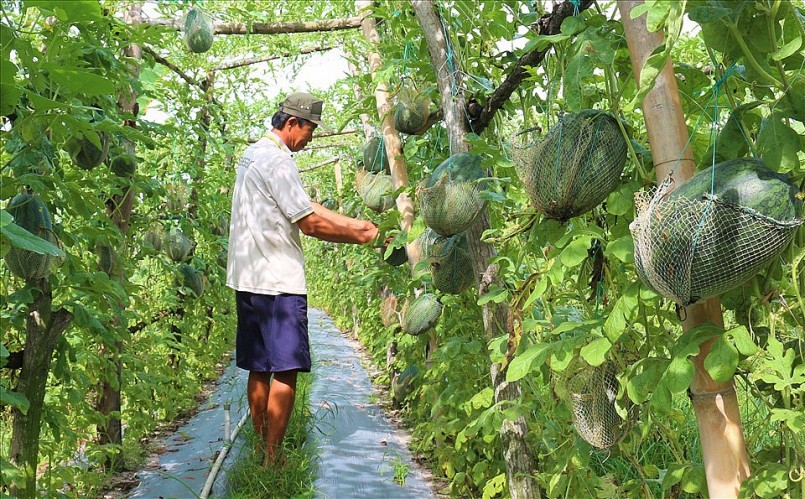 | Anh Huỳnh Công Quyển, xã Vĩnh Thành, huyện Châu Thành (An Giang), là nông dân tiên phong đưa dưa hấu lên giàn và trồng trong nhà lưới ở địa phương. Chuẩn bị vụ dưa Tết năm nay, anh xuống giống từ cuối tháng 10 (âm lịch), tăng diện tích canh tác lên 4 công đất trồng dưa hấu không hạt (giống “Mặt trời đỏ”), dự kiến thu hoạch vào khoảng 23, 24 tháng Chạp, năng suất khoảng 20 tấn. “Có kinh nghiệm, được cán bộ kỹ thuật của Trạm Khuyến nông huyện Châu Thành hướng dẫn kỹ thuật, ứng dụng công nghệ cao nên vụ Tết tôi thu lợi nhuận cao nhất. Năm nào, dưa hấu bán ra thị trường cũng đảm bảo chất lượng, thịt dưa chắc, ngọt, màu da sáng bóng, mua chưng mấy ngày Tết xong xẻ ra ăn ngon, không bị hư. Được khách hàng ăn khen ngon, khen đẹp còn gì vui bằng”, anh Quyển phấn khởi chia sẻ |