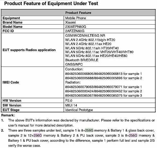 Theo thông tin được tiết lộ trong các tài liệu của FCC, Xiaomi hiện đang tiến hành thử nghiệm nghiêm ngặt trên ba nguyên mẫu Mi 13T. Hai trong số các nguyên mẫu được trang bị RAM 8GB và dung lượng lưu trữ ROM 256GB, đồng thời được phân biệt bằng chất liệu mặt sau, một mẫu có nắp lưng bằng kính và mẫu còn lại có nắp lưng bằng polyurethane (PU).