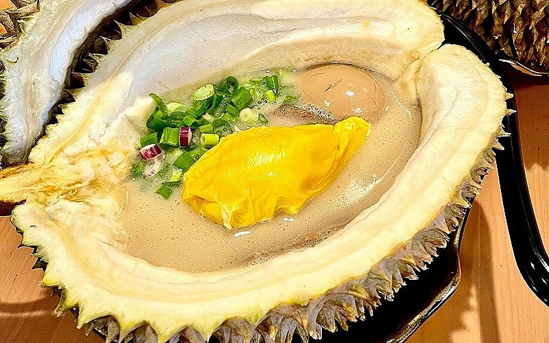 Mì sầu riêng là món ăn độc đáo, mới lạ được chế biến theo phong cách Nhật Bản. Mì được đựng trong vỏ sầu riêng cực kỳ ấn tượng. Một phần mì sầu riêng sẽ bao gồm mì, nước hầm từ xương heo, kết hợp cùng cơm sầu riêng đã xay nhuyễn, trứng luộc, thịt heo và các topping ăn kèm tùy thích..