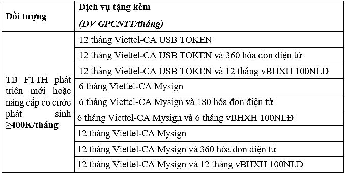 Theo đó, khách hàng đăng ký mới FTTH hoặc nâng cấp cước phát sinh từ 400.000đ/tháng và đóng cước trước sẽ được miễn phí gói giải pháp doanh nghiệp gồm chữ ký số ViettelCA USBToken/Mysign, dịch vụ Hóa đơn điện tử, vBHXH. Thời gian ưu đãi tương ứng với số tháng đóng cước trước của gói FTTH.