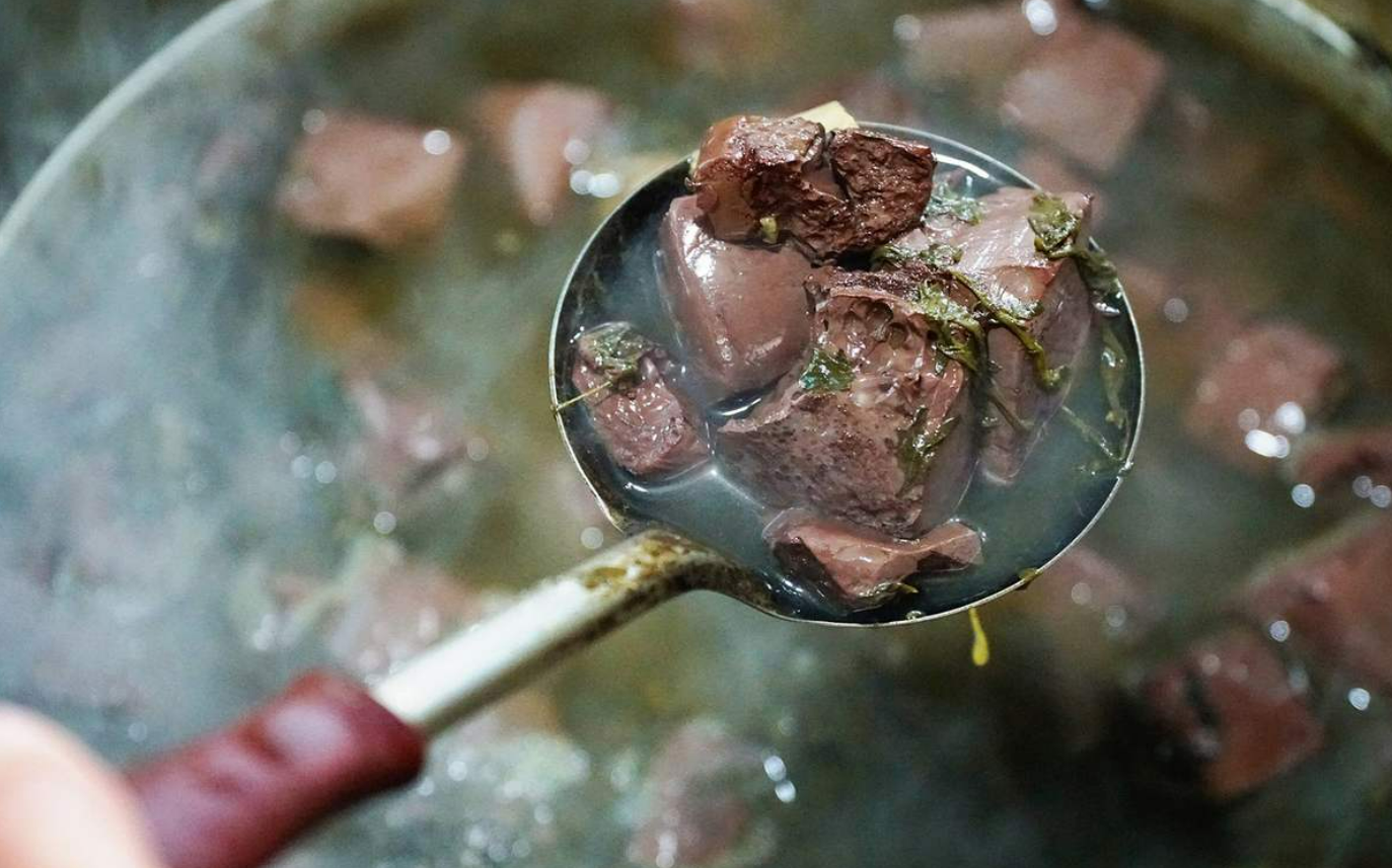 Ngoài trứng vịt lộn ra, thì tiết cũng là một món ăn kèm phổ biến. Tại bếp của những nơi bán món này luôn có một nồi trứng vịt lộn và một nồi tiết hầm cùng lá ngải cứu nên bạn có thể yêu cầu cả tiết và trứng để có món tiết và trứng vịt lộn hầm lá ngải cứu nhé.