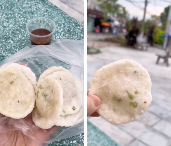 Những miếng bánh nhỏ nhắn, màu trắng ngà ngà điểm xuyết màu xanh của hành lá hay lấm chấm sắc cam của tôm khô. Mỗi bánh chỉ có giá khoảng 2500 đồng, tuy vẻ ngoài trông rất đơn giản nhưng bánh chị lại mang đến hương vị khá lạ miệng khi lớp ngoài giòn giòn, lớp bên trong lại có độ dẻo, dai.