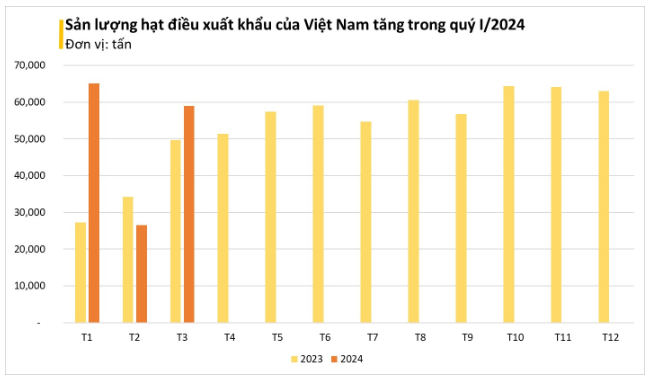 Theo thống kê từ Tổng cục Hải quan, xuất khẩu hạt điều của Việt Nam trong tháng 3 năm 2024 đạt 58.922 tấn, tương đương 315,4 triệu USD, tăng mạnh 121,6% về lượng và tăng 122,3% về kim ngạch so với tháng trước đó. Đây cũng là mức tăng trưởng mạnh nhất trong tất cả các mặt hàng xuất khẩu của Việt Nam.