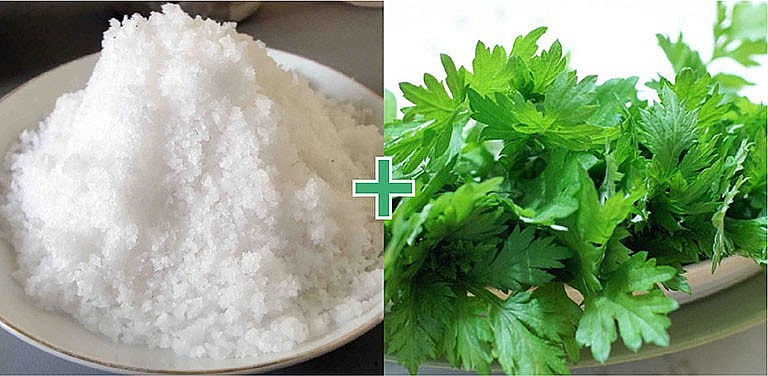 Sau đó, rửa lá ngải cứu bằng nước sạch và để thật ráo nước, rồi mới đem rang chung với muối cho nóng lên.