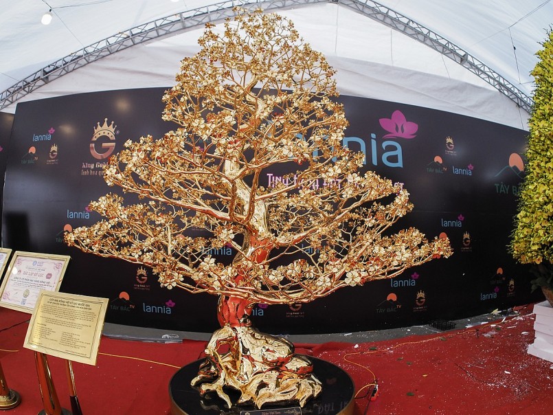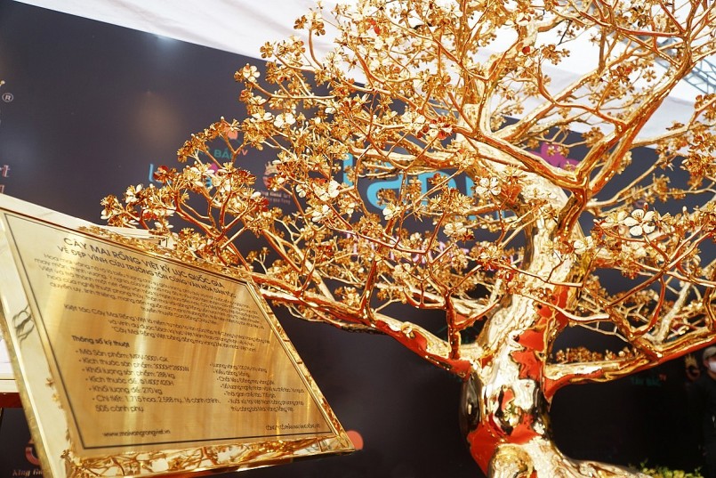 Cây mai được mạ bằng 121 chỉ vàng 24K và nặng 285 kg. Chiều ngang 2,8m và chiều cao là 3m. Cây mai vàng Rồng Việt hiện tại có giá 5,5 tỷ đồng.