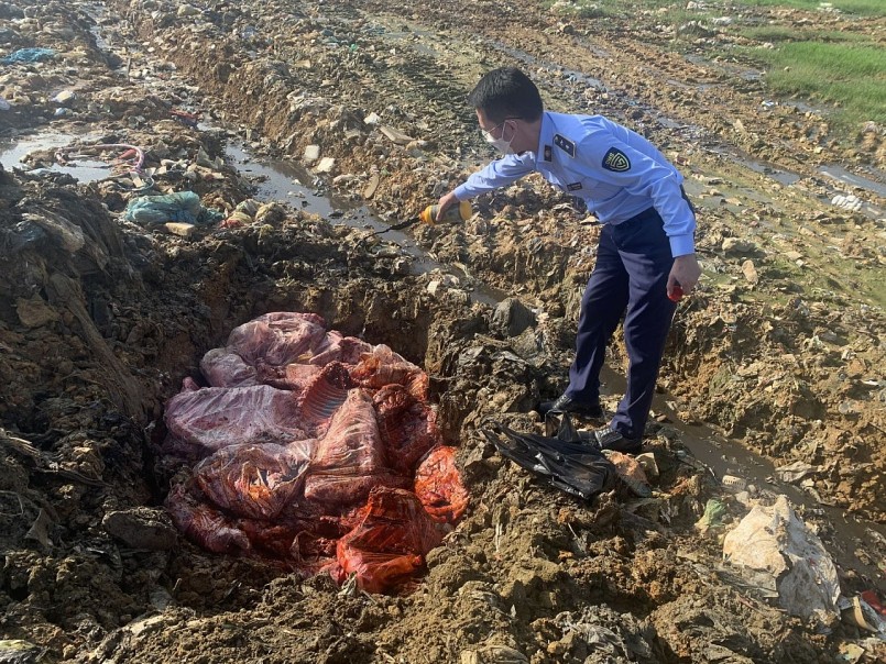 Tại thời điểm kiểm tra trên thùng hàng phía sau xe chứa 650kg thịt sườn lợn đã bốc mùi hôi thối nồng nặc. Đặc biệt là mặt hàng thực phẩm cần được bảo quản và vận chuyển trên xe chuyên dụng để đảm bảo vệ sinh an toàn thực phẩm. Tuy nhiên, toàn bộ số hàng hóa lại được vận chuyển trên thùng sau xe tải.