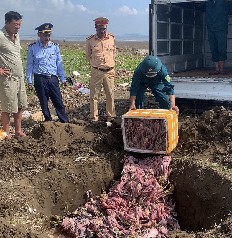Tại thời điểm kiểm tra, đoàn kiểm tra phát hiện phương tiện đang vận chuyển 150kg thịt chim đông lạnh (đựng trong 04 thùng xốp), toàn bộ số hàng trên không có hóa đơn chứng từ chứng minh nguồn gốc xuất xứ; đã bốc mùi hôi thối.