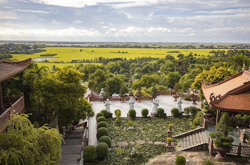 Chùa nằm trên triền núi Sam nên đón gió mát lành. Từ đây du khách có thể ngắm nhìn cảnh quan đồng ruộng biên giới An Giang một màu xanh ngắt. Du khách tới thăm chùa nên chú ý lựa trang phục phù hợp, tránh mang giày cao gót do cung đường di chuyển gồm nhiều bậc thang.