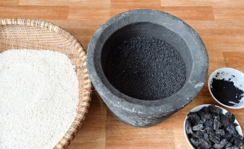Sau đó thì trộn bột than với gạo đã vo sạch cho đến khi gạo đã quyện chặt với bột than thành màu đen nhánh. Sau đó sàng cho đỡ bị cặn là có thể bắt đầu làm bánh rồi.