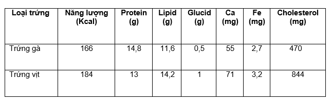 Một quả trứng khoảng 50g chứa 186 mg cholesterol, chiếm 62% lượng tiêu thụ hàng ngày được khuyến nghị, lòng trắng chủ yếu là protein. Một số nghiên cứu khác đã kiểm tra tác động của trứng đối với mức cholesterol.