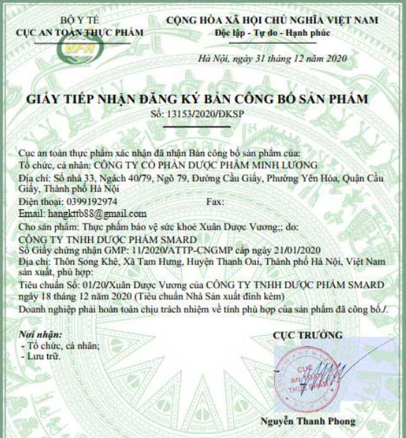 Được biết, sản phẩm thực phẩm bảo vệ sức khỏe Xuân Dược Vương do Công ty Cổ Phần Dược Phẩm Minh Lương, địa chỉ: Số nhà 33, Ngách 40/79, Ngõ 79, Đường Cầu Giấy, phường Yên Hòa, quận Cầu Giấy, TP. Hà Nội công bố và chịu trách nhiệm sản phẩm.