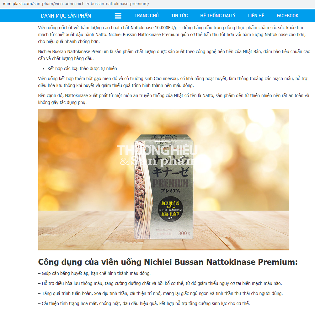 Còn tại http://mimiplaza.com/san-pham/vien-uong-nichiei-bussan-nattokinase-premium/ sản phẩm NATTOKINASE PREMIUM được quảng cáo với công dụng: “Giúp cân bằng huyết áp, hạn chế hình thành máu đông; Hỗ trợ điều hòa lưu thông máu, tăng cường dưỡng chất và bồi bổ cơ thể, từ đó giảm thiểu nguy cơ tai biến mạch máu não; Tăng quá trình tuần hoàn, xoa dịu tinh thần, cải thiện trí nhớ, mang lại giấc ngủ ngon và tinh thần thư thái cho người dùng; Cải thiện tình trạng hoa mắt, chóng mặt, đau đầu hiệu quả, kết hợp hỗ trợ tăng cường sinh lực cho cơ thể.”