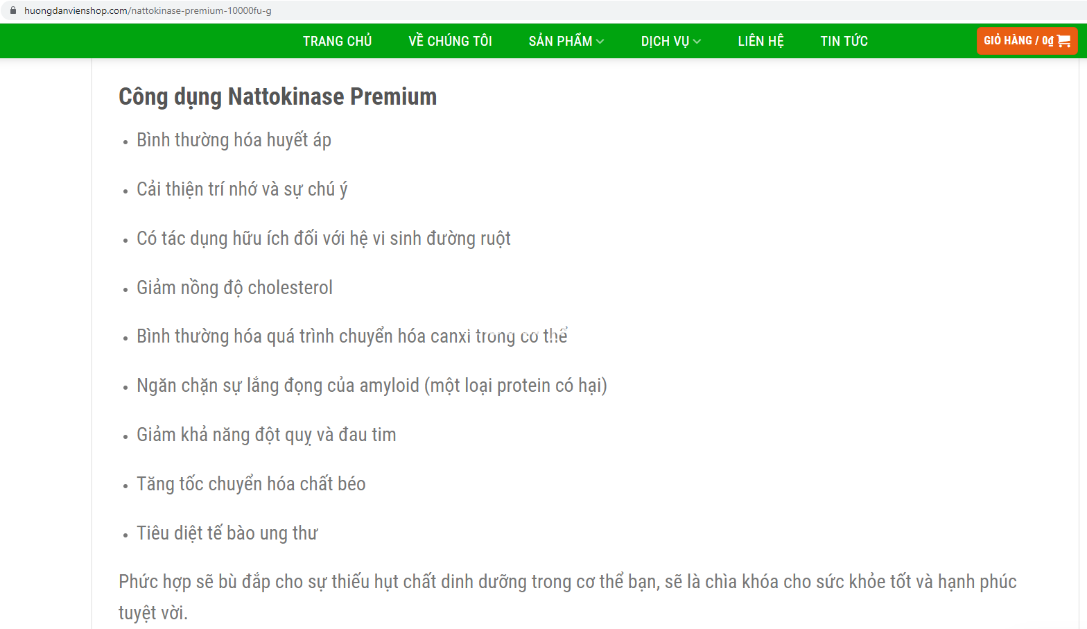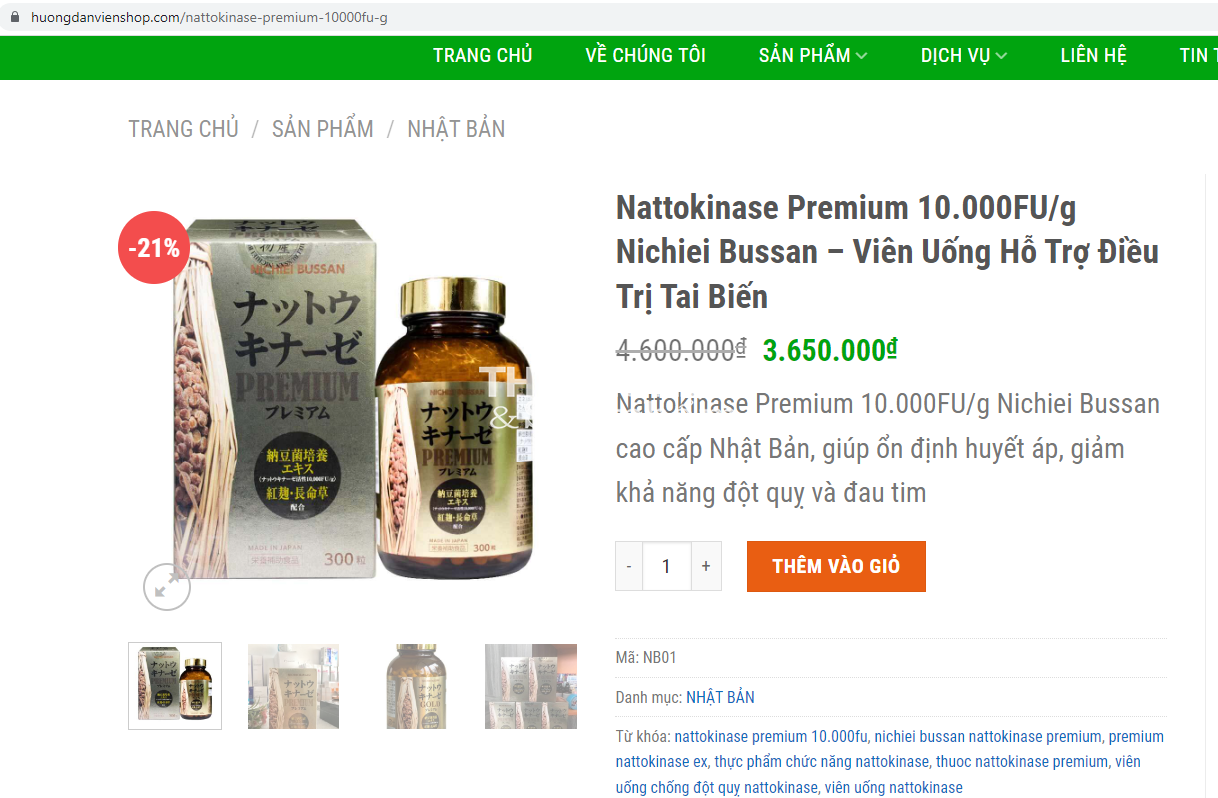Cụ thể tại website https://japana.vn/vien-uong-ho-tro-dieu-tri-tai-bien-nichiei-bussan-nattokinase-premium-300-vien-sp-8189 sản phẩm NATTOKINASE PREMIUM được “nổ” với công dụng: “Cải thiện trí nhớ và sự chú ý; Có tác dụng hữu ích với hệ vi sinh đường ruột; Giảm nồng động cholesterol; Ngăn chặn sự lắng động của amyloid; Giảm khả năng đột quỵ và đau tim; Tiêu diệt tế bào ung thư; …”