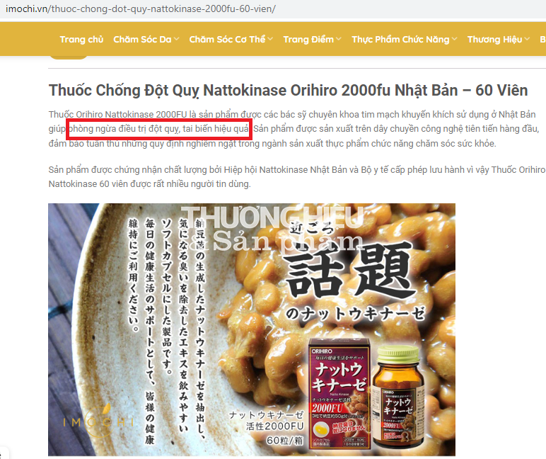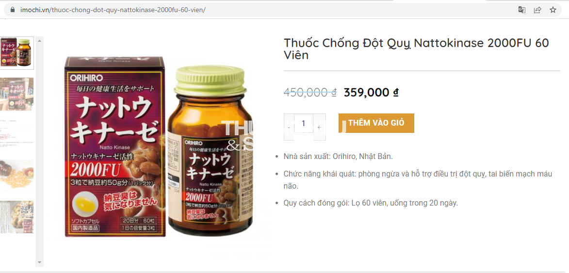 Còn tại https://imochi.vn/thuoc-chong-dot-quy-nattokinase-2000fu-60-vien/ sản phẩm Orihiro Nattokinase capsules được đặt hẳn là “Thuốc chống đột quỵ NattoKinase 2000FU”. Công dụng: “phòng ngừ điều trị đột quỵ, tại biến hiệu quả”. Không những vậy trong “Thuốc chống đột quỵ NattoKinase 2000FU” còn có thành phần NattoKinase có tác dụng ngăn ngừa ung thư.