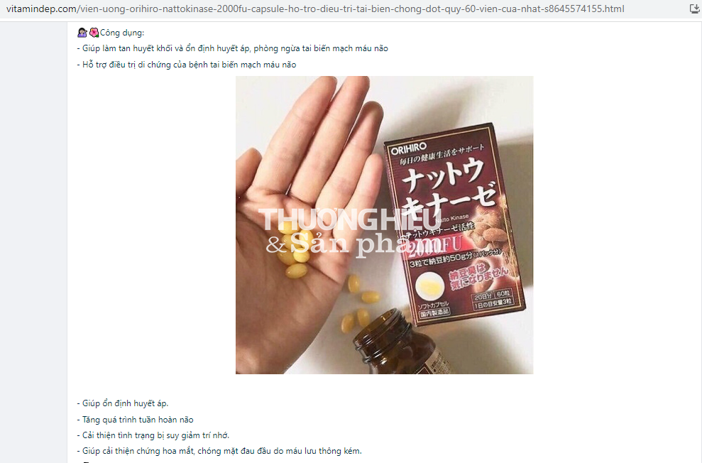 Sản phẩm thực phẩm bảo vệ sức khỏe Orihiro Nattokinase capsules được website trên đặt với tên gọi: “Viên uống ORIHIRO NattoKinase 2000FU Capsule hỗ trợ điều trị tai biến, chống đột qụy 60 viên của Nhật”.