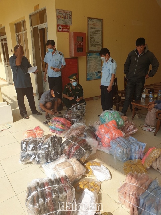 TH&SP Hai bao tải khẩu trang được nguỵ trang là quần áo hòng xuất lậu qua Campuchia vừa bị Chi cục Hải quan cửa khẩu Dinh Bà (Cục Hải quan Đồng Tháp) phối hợp với Bộ đội Biên phòng nơi đây phát hiện, bắt giữ.