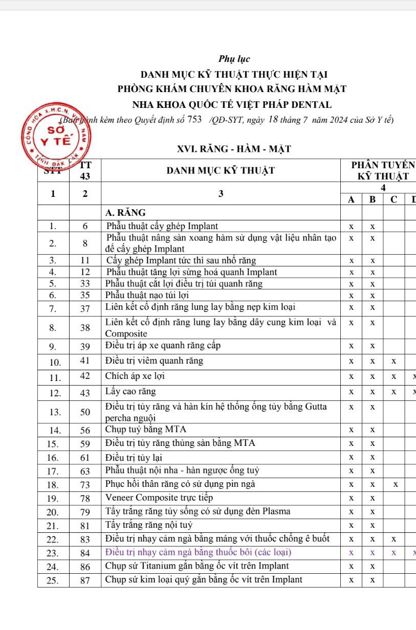Bên cạnh đó, Sở Y tế Đắk Lắk cũng phê duyệt cho Nha khoa Việt Pháp các danh mục như: chụp sứ Titannium gắn bằng ốc vít trên Implant; chụp sứ kim loại quý gắn bằng ốc vít trên Implant; chụp sứ toàn phần gắn bằng ốc vít trên Implant; chụp sứ kim loại thường gắn bằng cement trên Implant...