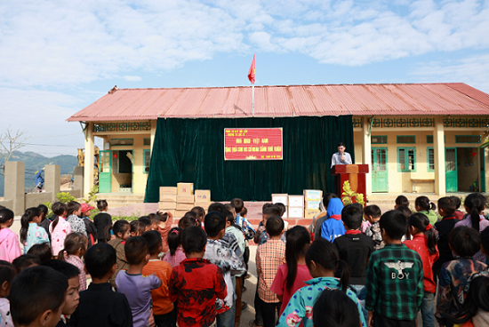 | Ông Hà Sỹ Chuẩn – Chánh Văn phòng NXBGDVN tặng qùa cho các học sinh có hoàn cảnh khó khăn tại Trường Tiểu học Cốc Lỳ |