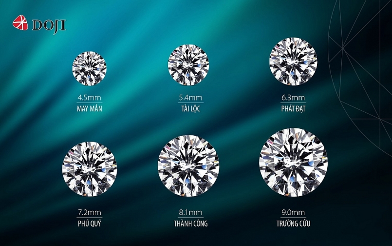| Bộ sưu tập kim cương viên “Bách Lộc Trường Cửu” gồm những viên kim cương kích thước đẹp, tổng 9 nút (4.5 mm; 5.4 mm; 6.3 mm; 7.2 mm; 8.1 mm và 9.0 mm). |
