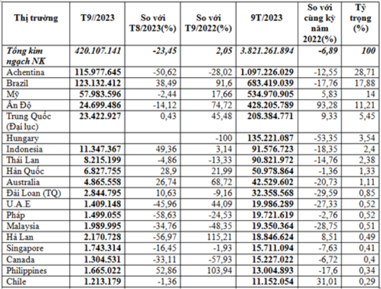 Đứng thứ 2 là thị trường Brazil chiếm tỷ trọng 17,9%, đạt gần 683,42 triệu USD, giảm 17,8% so với cùng kỳ; riêng tháng 9/2023 nhập khẩu từ thị trường này đạt 123,13 triệu USD, tăng mạnh 38,5% so với tháng 8/2023 và tăng 91,6% so với tháng 9/2022.