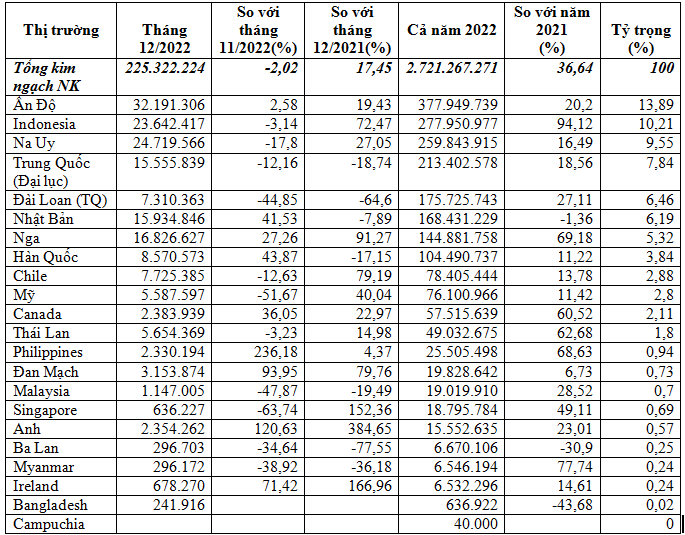 Tiếp đến thị trường Na Uy đạt 259,84 triệu USD trong năm 2022, chiếm 9,6% trong tổng kim ngạch nhập khẩu, tăng 16,5%; Trung Quốc đạt 213,4 triệu USD, chiếm 7,8%, tăng 18,6%; Đài Loan đạt 175,73 triệu USD, chiếm 6,5%, tăng 27%.