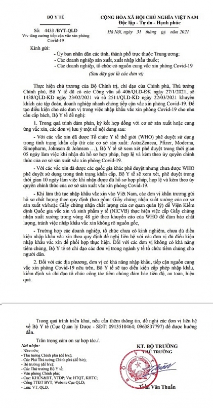 Đặc biệt để tạo điều kiện cho các đơn vị trong việc nhập khẩu vắc-xin phòng Covid-19, ngày 31/5/2021 Thứ trưởng Bộ Y tế Trần Văn Thuấn đã ký ban hành Công văn số 4433/BYT-QLD gửi UBND các tỉnh, thành phố trực thuộc Trung ương; các doanh nghiệp sản xuất, xuất nhập khẩu thuốc; các doanh nghiệp, tổ chức có nguồn cung vắc-xin phòng Covid-19. Nội dung của công văn này về việc “tăng cường tiếp cận vắc-xin phòng Covid-19”.