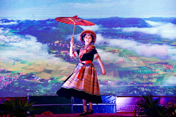 | Phần thi trình diễn trang phục dân tộc của thí sinh Hoàng Thị Hương Giang, xã Vũ Sơn |