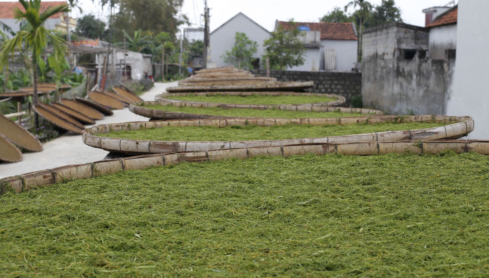 Thuốc lào sau khi được cắt nhỏ dùng đũa chuyên dụng trên các nong phơi.