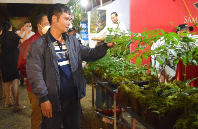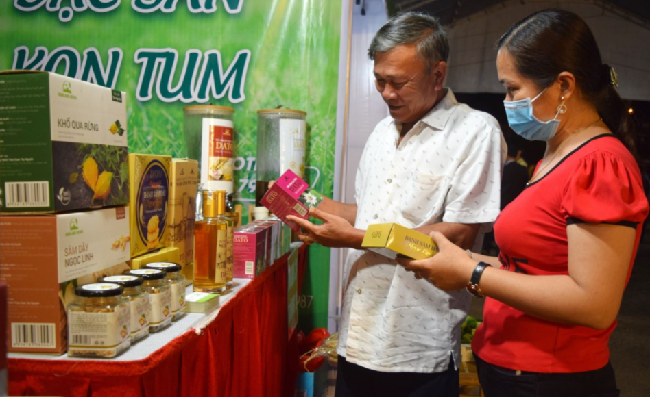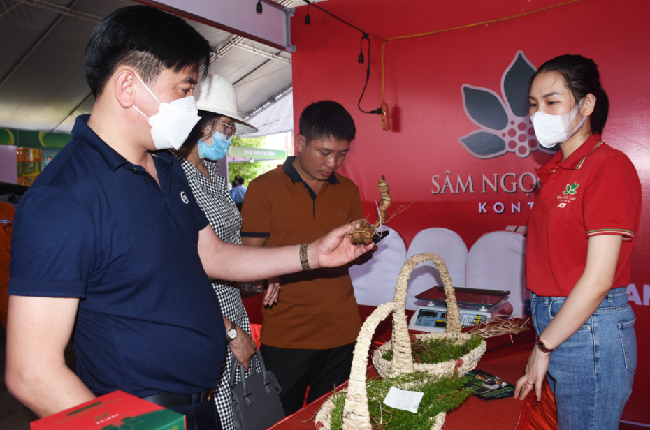 | Sâm Ngọc Linh trưng bày tại Phiên chợ được gắn tem truy xuất nguồn gốc tạo lòng tin với du khách |