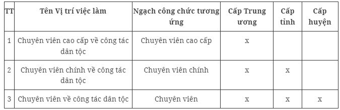 Cụ thể, danh mục vị trí việc làm công chức nghiệp vụ chuyên ngành công tác dân tộc được quy định như sau: