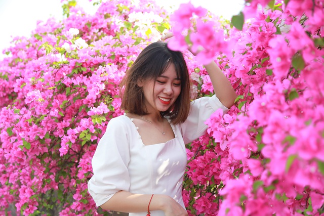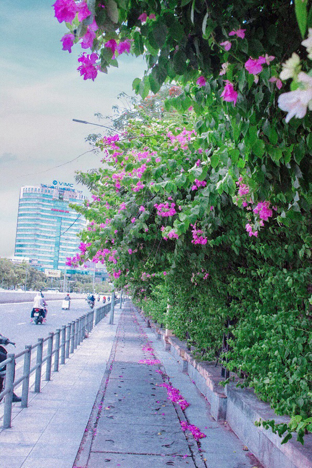 Giàn hoa giấy được trải dài suốt chiều dài cây cầu, khiến cây cầu trở nên rực rỡ, thu hút biết bao bạn trẻ không ngại đường xa tới đây để cho ra đời những bộ hình cực hot trên MXH.