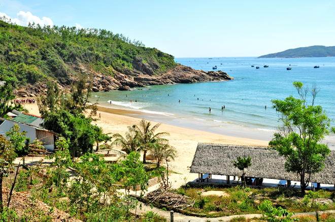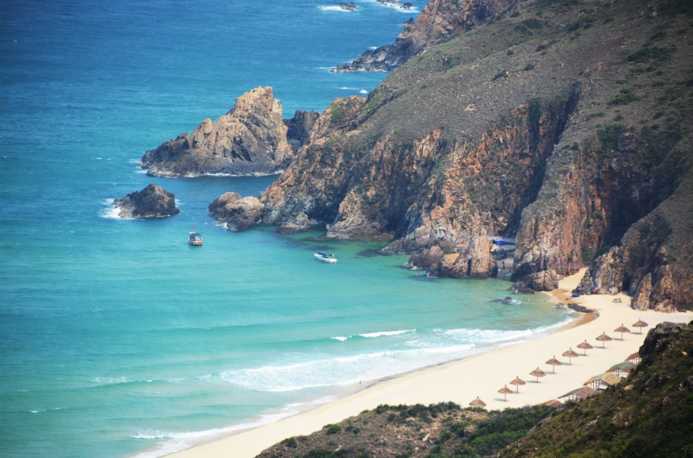 Những gành đá núi kỳ vĩ và bãi cát vàng nguyên sơ ôm lấy bờ biển trong xanh, êm đềm. Do vị trí địa lý một mặt giáp biển, ba mặt còn lại là núi nên chỉ có hai cách để bạn đến đây. Từ thôn Xương Lý (hoặc Hưng Lương), di chuyển bằng thuyền hoặc canô chỉ mất khoảng 20-30 phút là đến nơi.