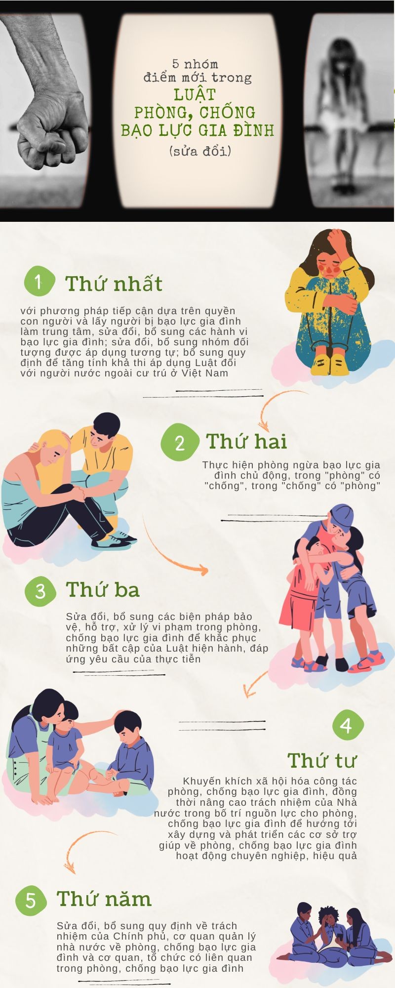 Luật phòng, chống bạo lực gia đình 2022 có hiệu lực thi hành từ 1/7/2023 gồm 6 chương, 56 điều, tăng 10 điều so với Luật 2007, trong đó có một số điểm mới.