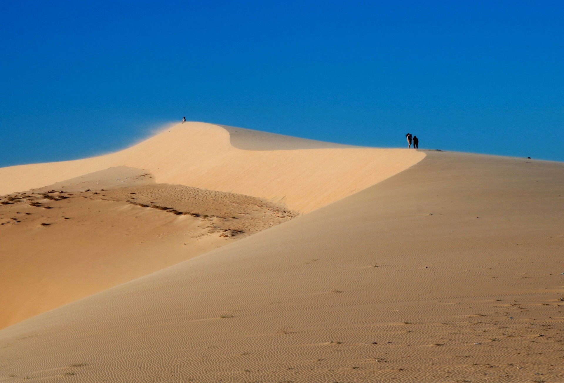 Nhiều đôi nam nữ nắm tay nhau lên đỉnh đồi cát giang rộng cánh tay như muốn ôm trọn những làn gió từ đại dương thổi vào.