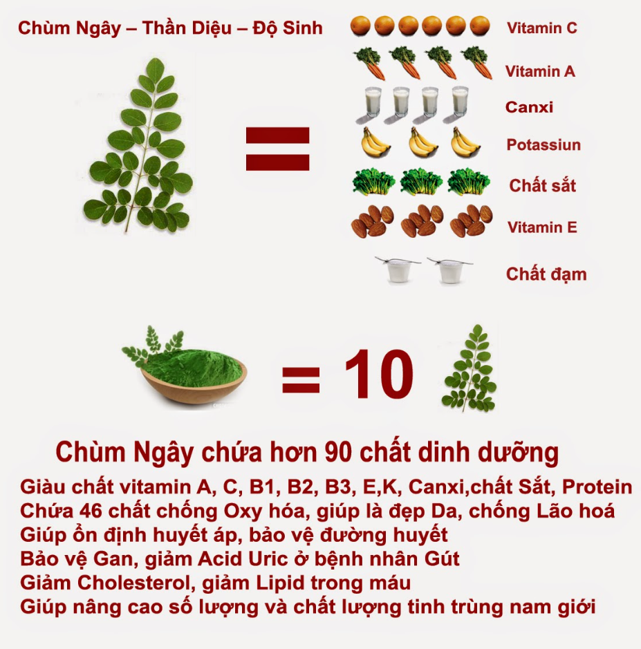 Cây chùm ngây còn chứa đựng nhiều dưỡng chất hơn cả các loại trái cây phổ biến hiện nay. Trong đó thì lượng vitamin C của cây cao hơn quả cam 7 lần, vitamin A cao hơn cà rốt đến 4 lần, lượng canxi cao gấp 4 lần có trong sữa, hàm lượng chất sắt cao gấp 3 lần rau chân vịt, lượng đạm nhiều gấp đôi so với sữa chua và hoạt chất potassium cao gấp 3 lần có trong quả chuối.