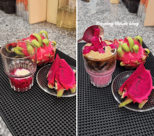 Thoạt nhìn qua, ly cà phê thanh long này trông khá bắt mắt và có phần cuốn hút bởi hiếm có ly cà phê sữa nào phân tầng nâu - hồng thế này. Các pha cà phê thanh long cũng rất đơn giản. Bạn chỉ cần dằm nhuyễn khoảng 30gr thanh long đỏ, cho vào cốc cùng 30ml sữa đặc, 50ml sữa tươi và khuấy đều. Sau đó thêm đá viên và 30ml cà phê đen đánh bọt cùng vài miếng thanh long cắt nhỏ lên trên là xong.