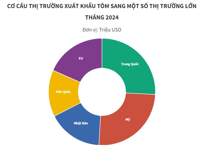 Trong số các thị trường nhập khẩu chính, xuất khẩu tôm Việt Nam sang Trung Quốc ghi nhận tăng trưởng mạnh nhất 275% đạt 42 triệu USD trong tháng 1/2024. Nhờ tăng trưởng mạnh, Trung Quốc là thị trường nhập khẩu tôm lớn nhất của Việt Nam trong tháng 1/2024, chiếm tỉ trọng 17,5%.