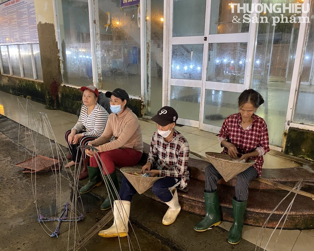 Chị Phan Thị Cầu (mang ủng trắng) ngồi cùng nhóm người gánh cá nghỉ ngơi một lát. |