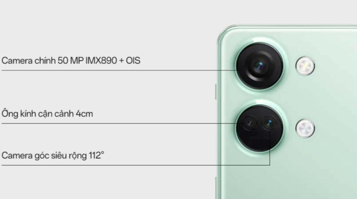 Mặt lưng chứa 2 ống kính chứa 3 cảm biến chính. Camera chính 50MP, hỗ trợ chống rung quang học OIS, quay phim 4K@60fps, cảm biến góc siêu rộng 8MP, cảm biến macro 2MP.